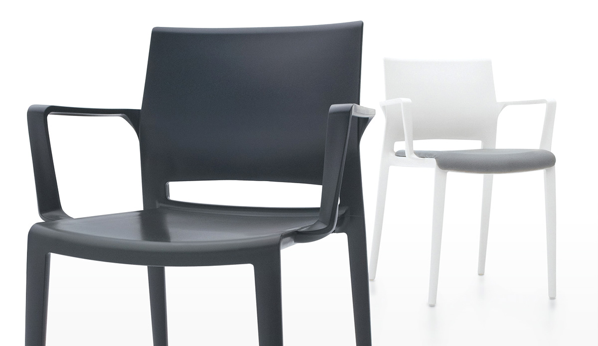 A lightweight stacking stool is the newest seating addition to the Bakhita series. Featuring the same innovative molding technology as Bakhita chairs, these weather resistant bar stools are available in a neutral palette that will fit in anywhere.