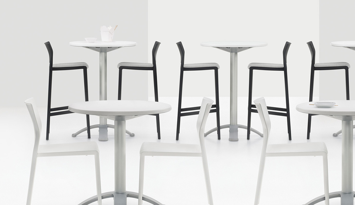 Weather resistant Bakhita tables work double duty, indoors and out, to create lively common areas, patios and cafeterias. A stable four-legged base enables seating to tuck in effortlessly. Standard and bar height tables are offered in 28” round and square tops, in Milk with Silver bases